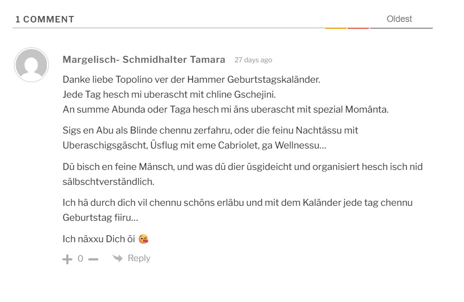 Ich hä mier erläubt, Dier eu en chleine Geburtstagskaländer zmache. Der geid Rückwärts – fa 24 zrugg uf 1 – wie 1. Eugschte. 🙂